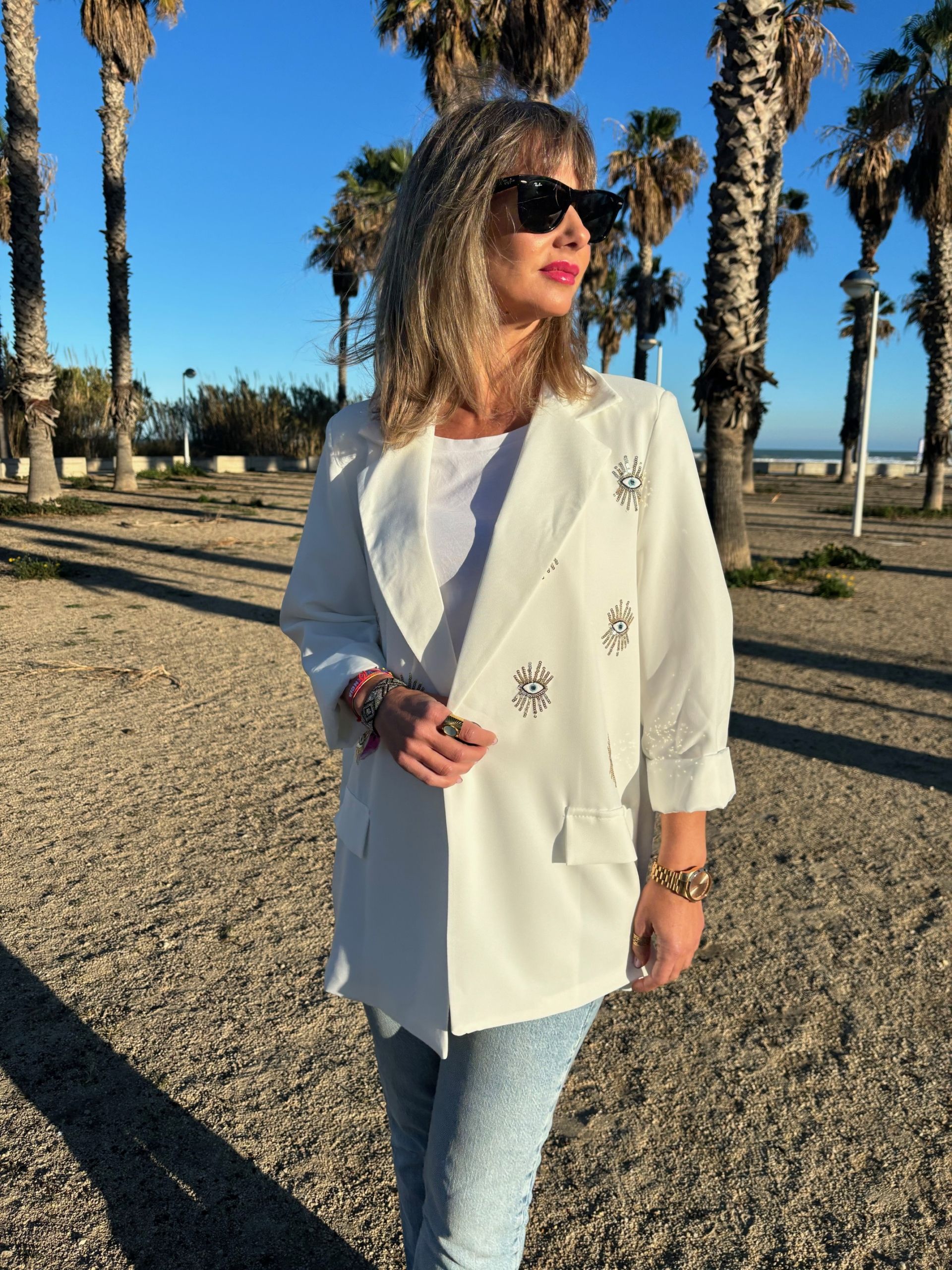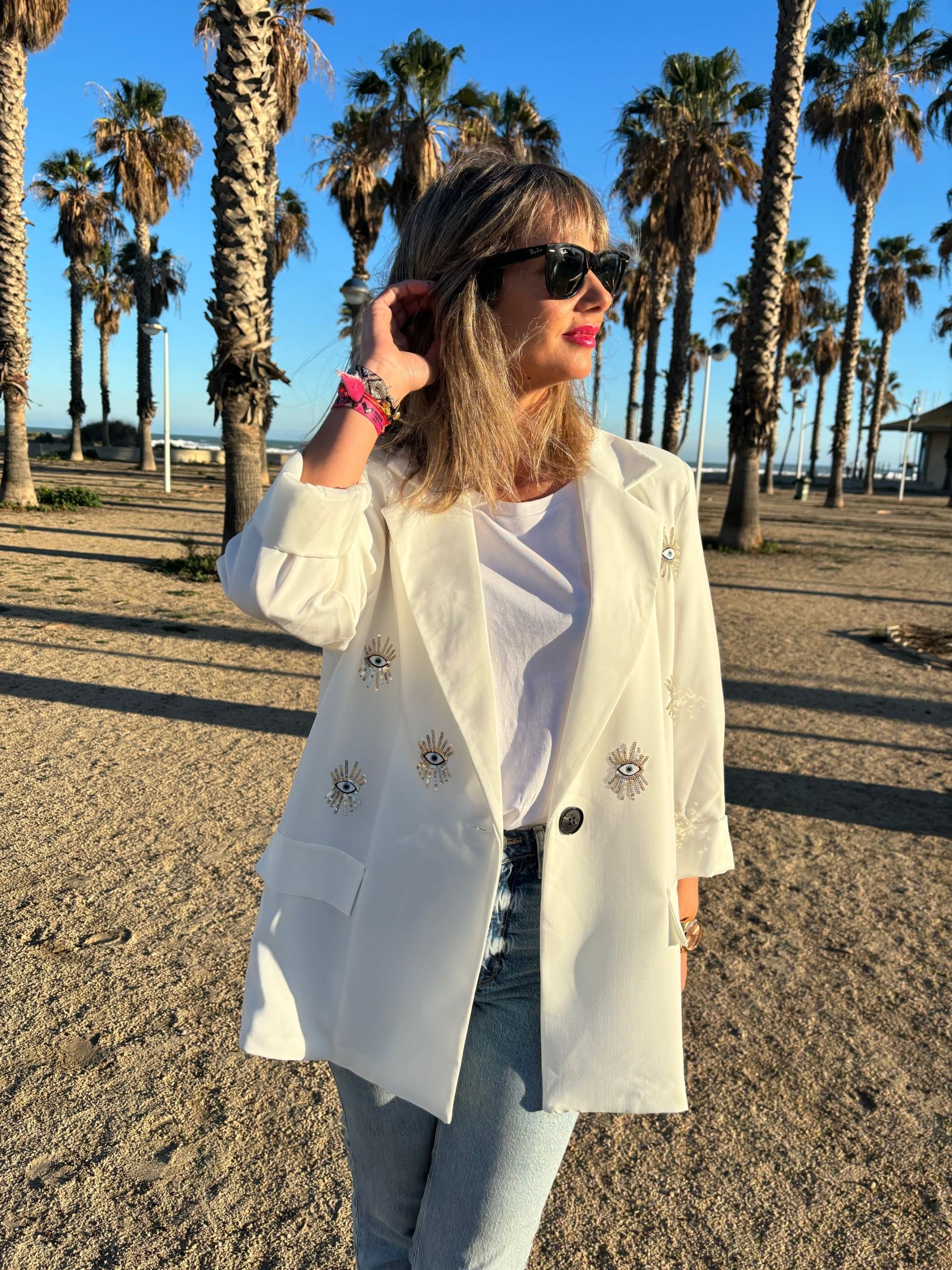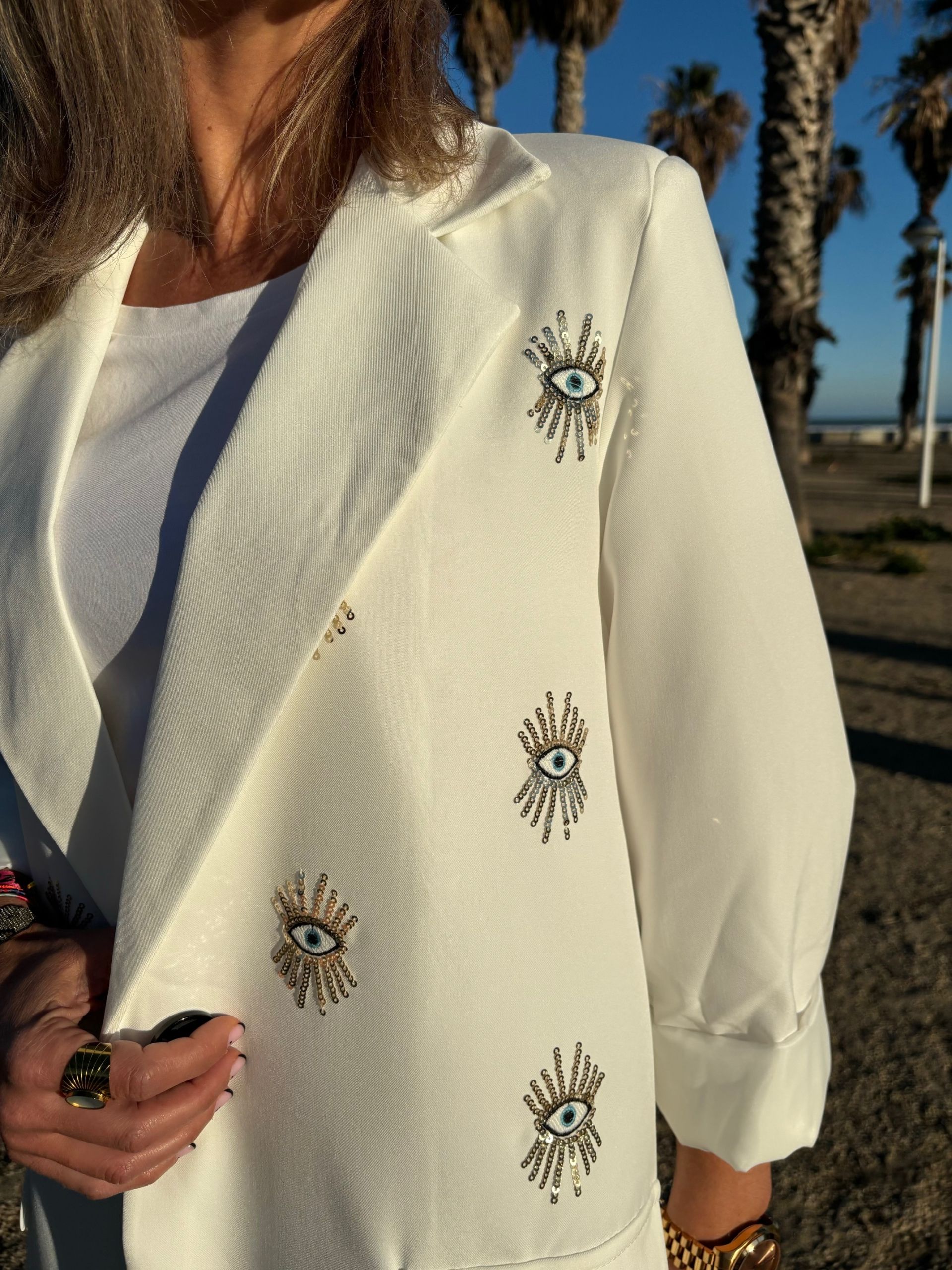 Americana blanca estilo oversize con detalle ojos bordados y lentejuelas