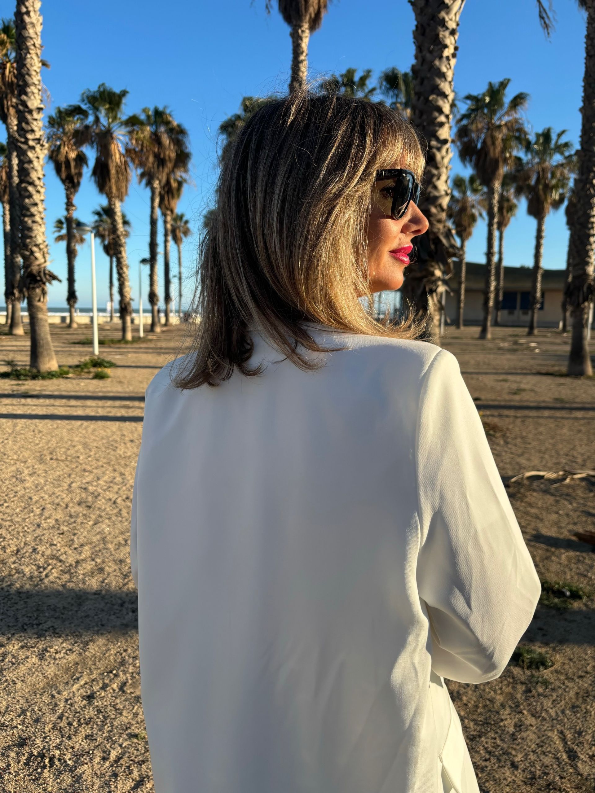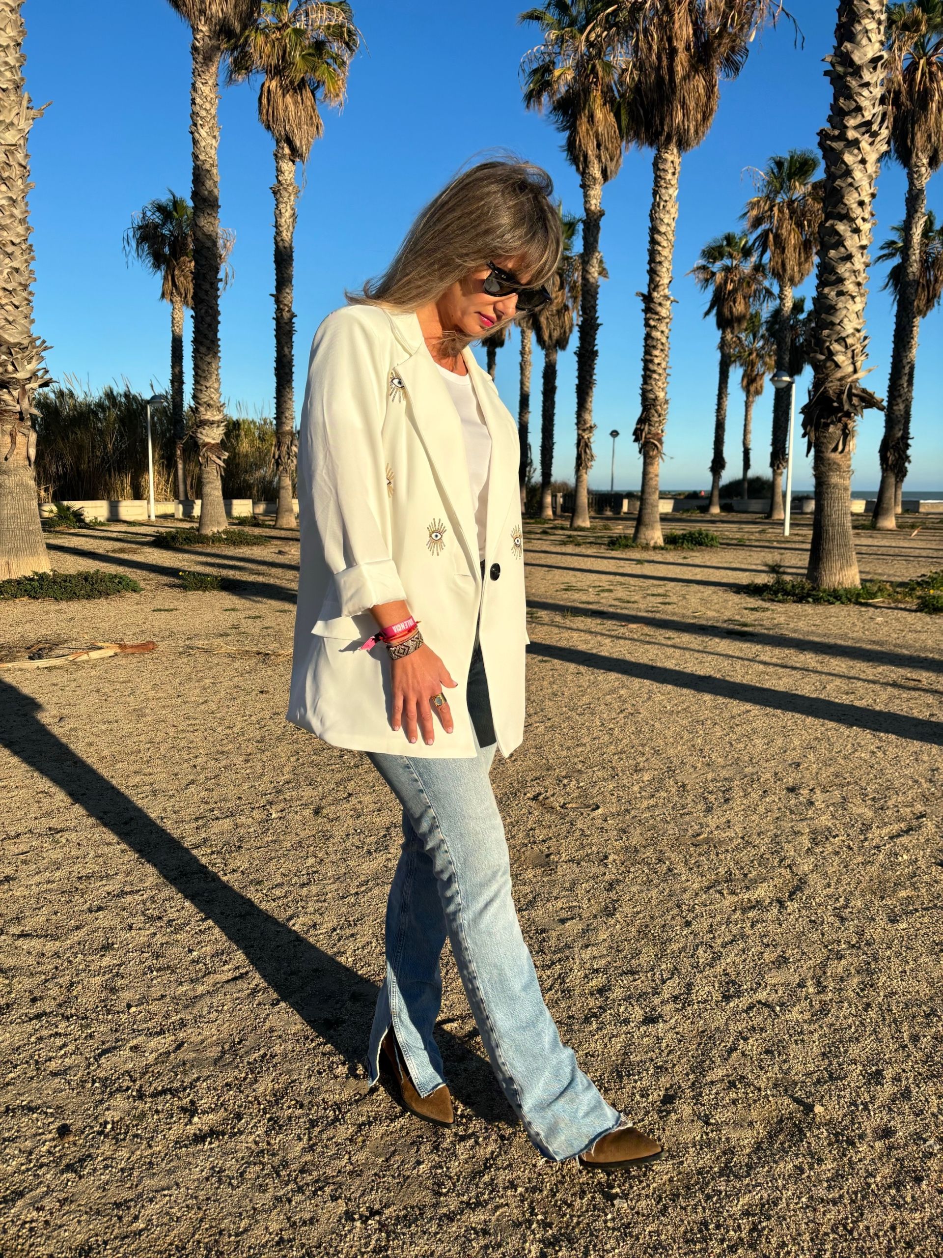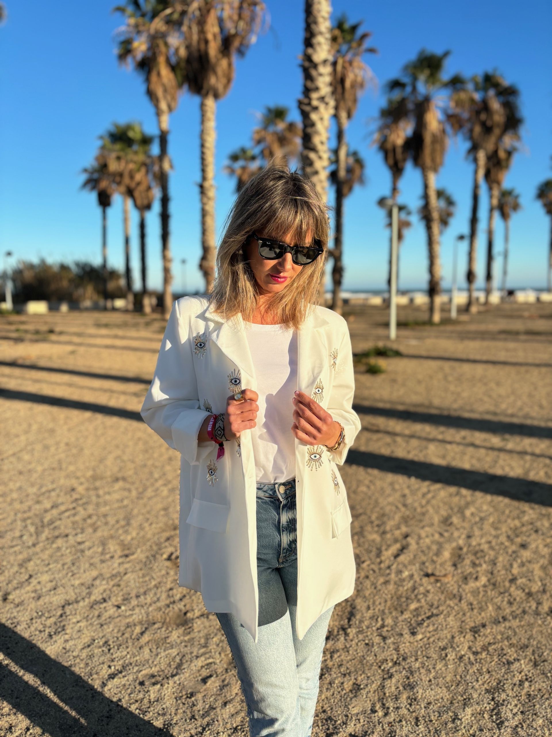 Americana blanca estilo oversize con detalle ojos bordados y lentejuelas