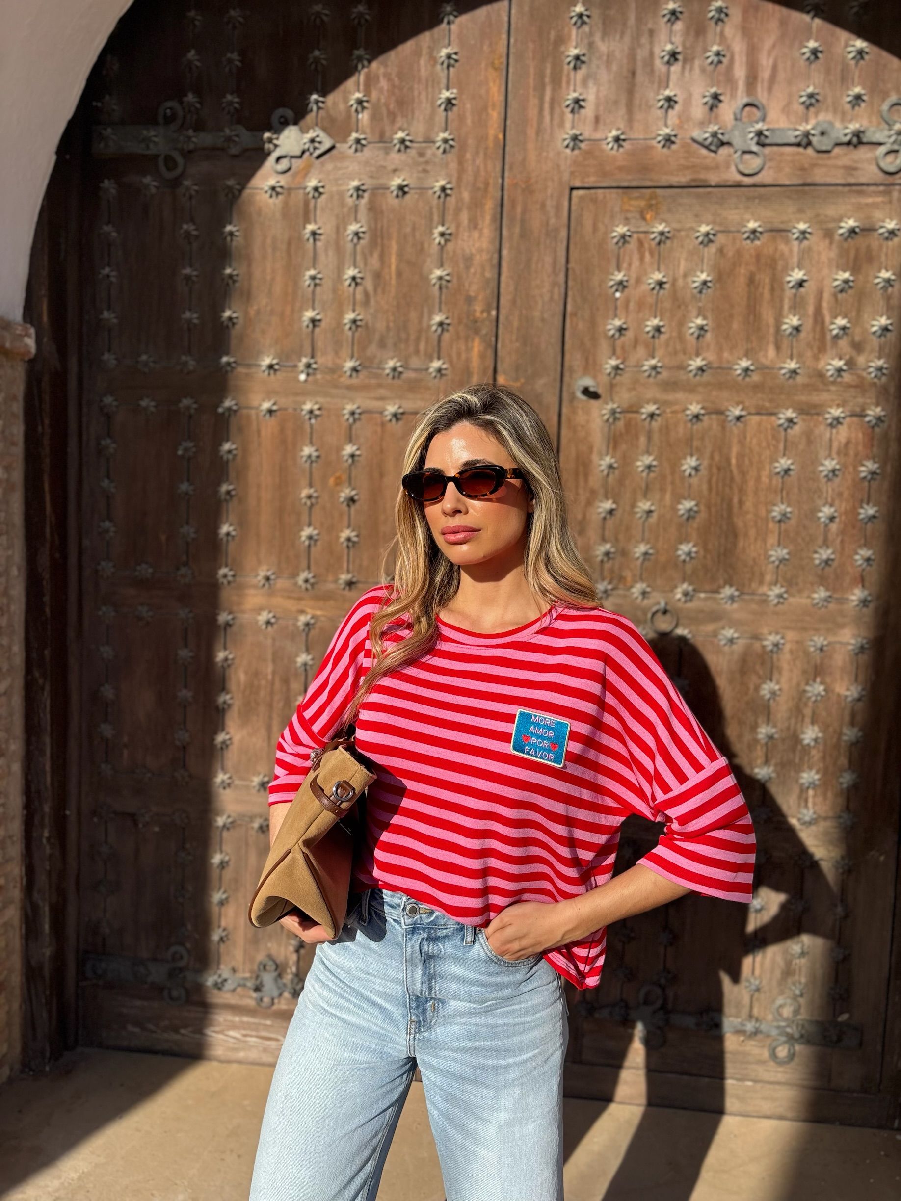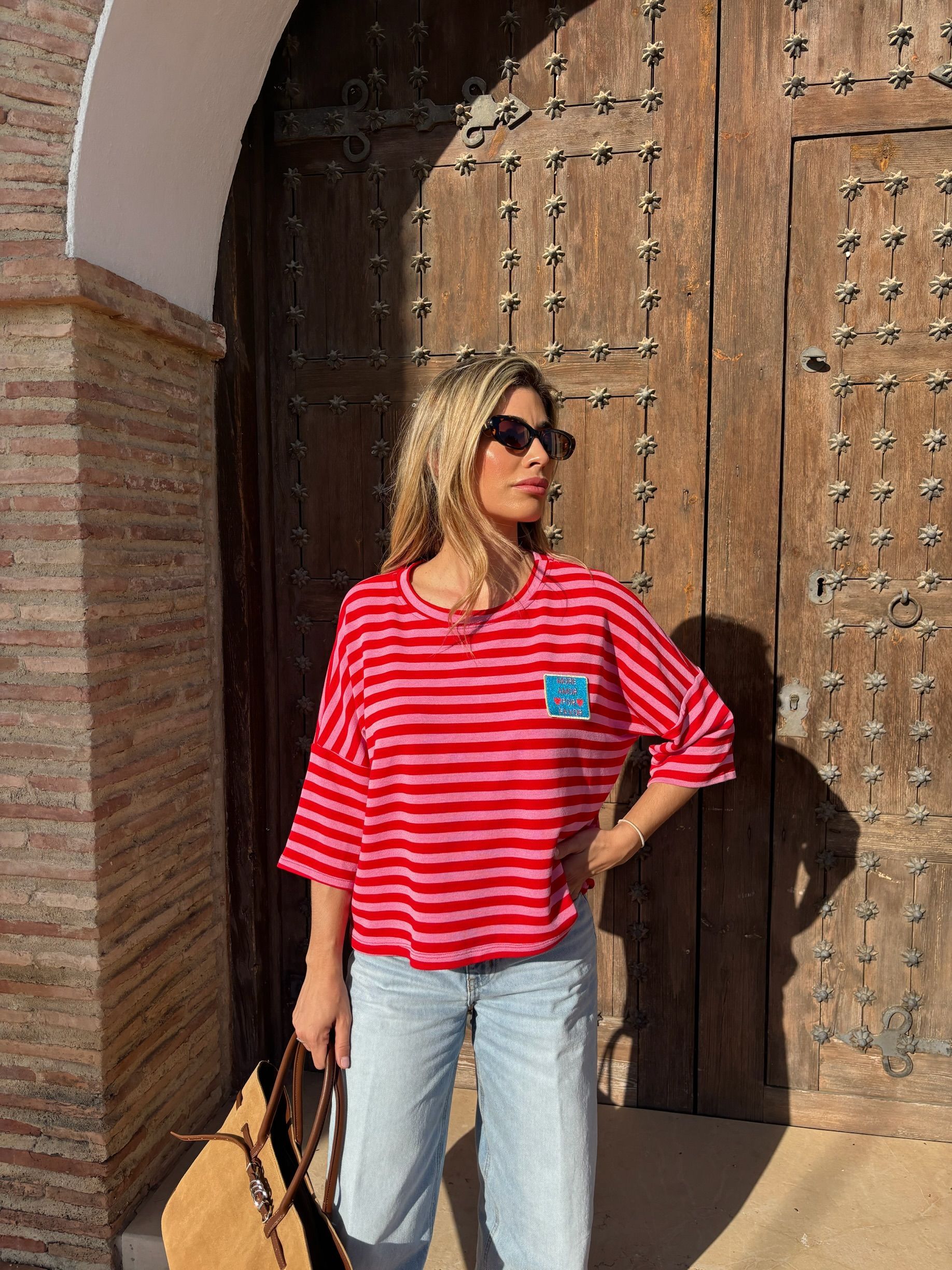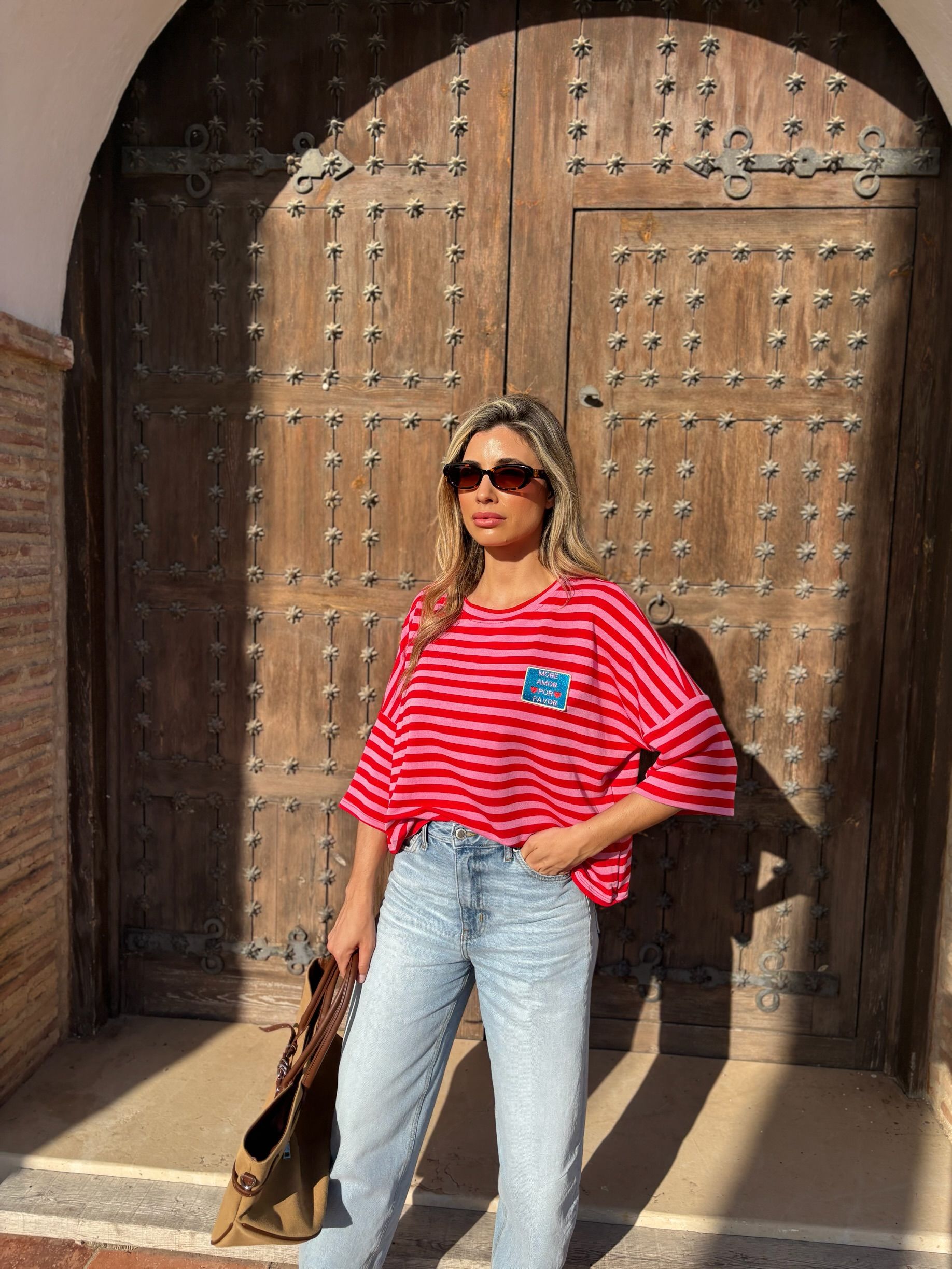 Camiseta oversize rayas en rojo y rosa. Detalle parche en bordado.