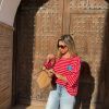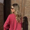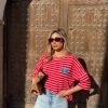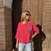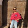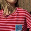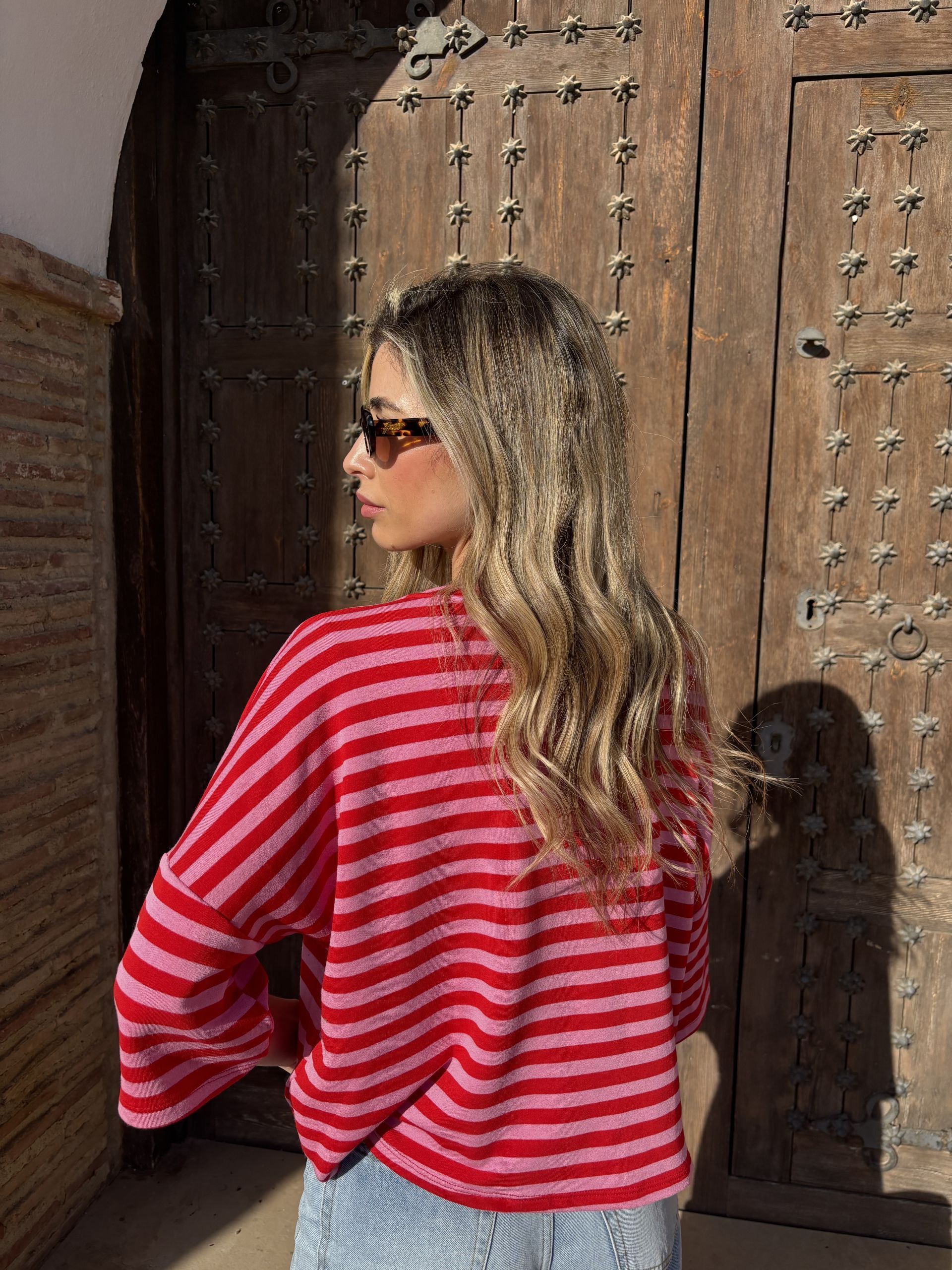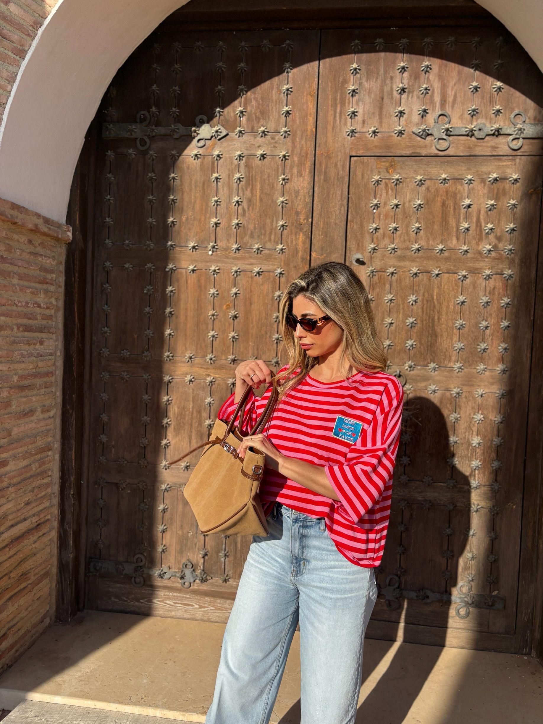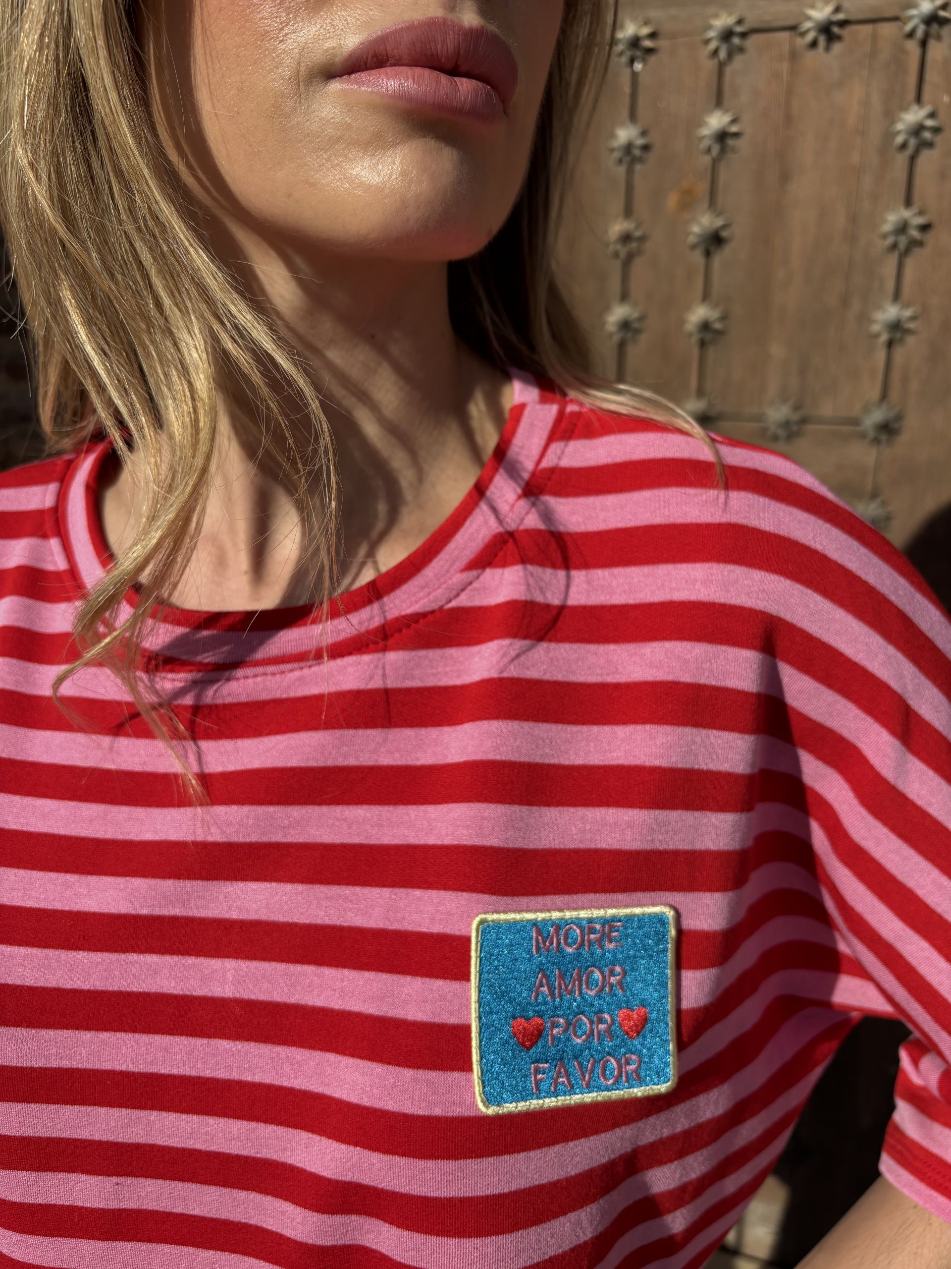 Camiseta oversize rayas en rojo y rosa. Detalle parche en bordado.