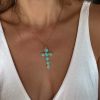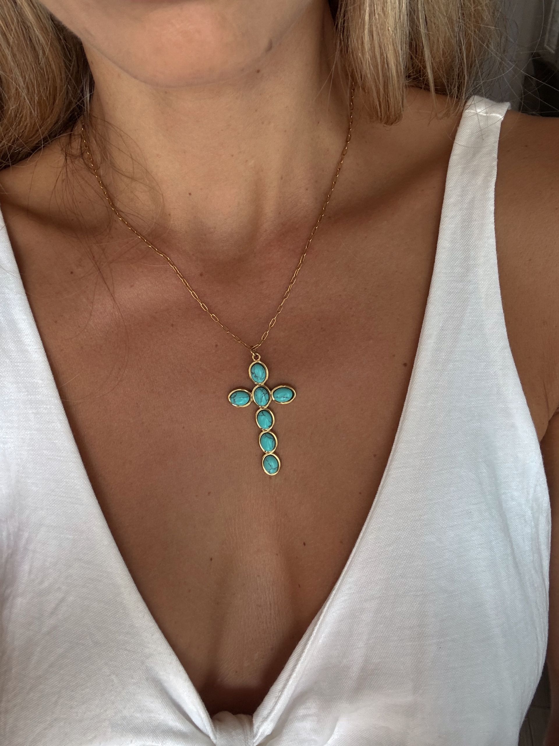 Cruz en ideas turquesas y detalles en dorado. Sin duda el toque final para un lookazo.