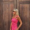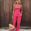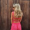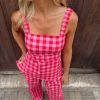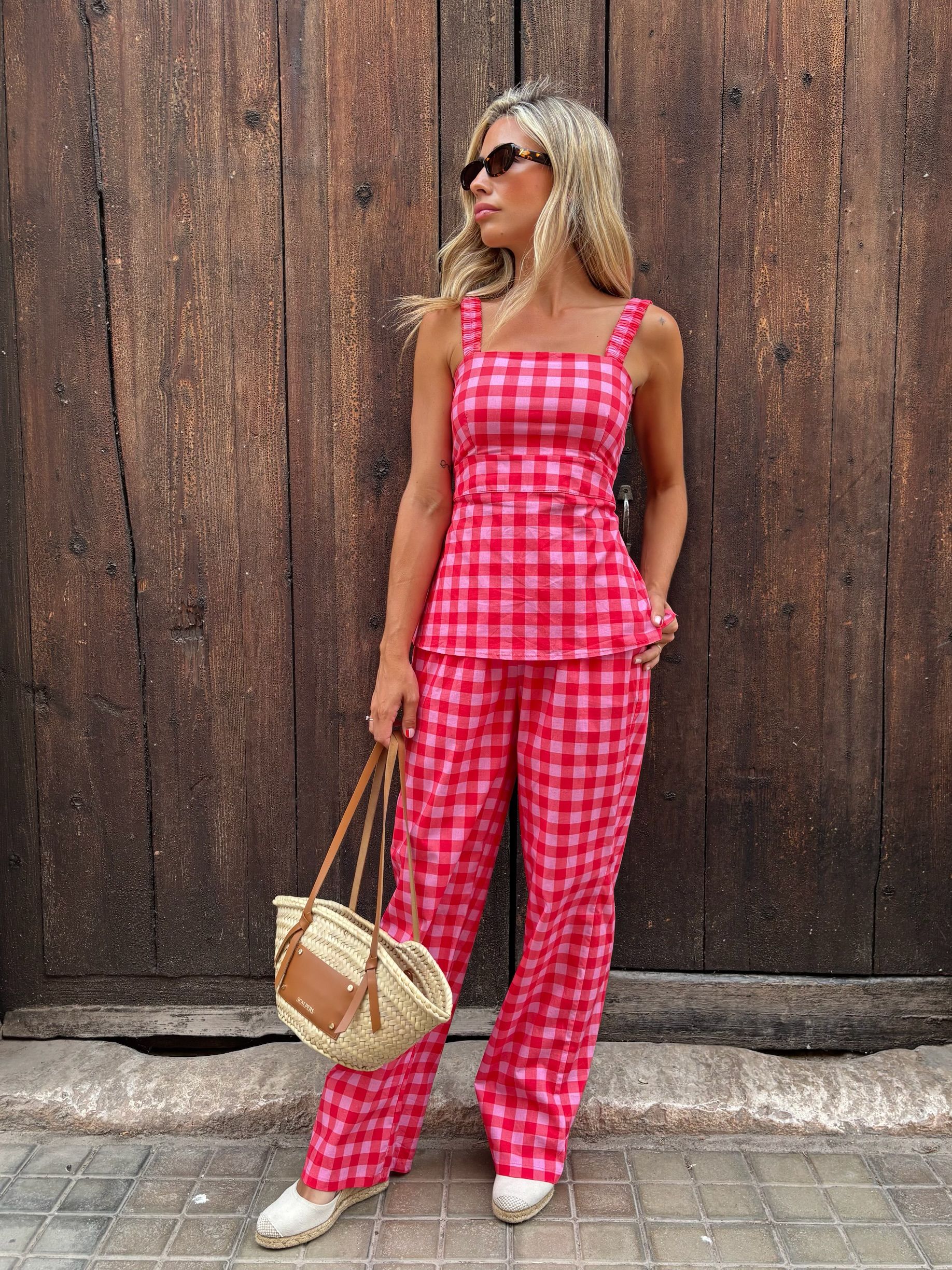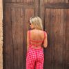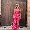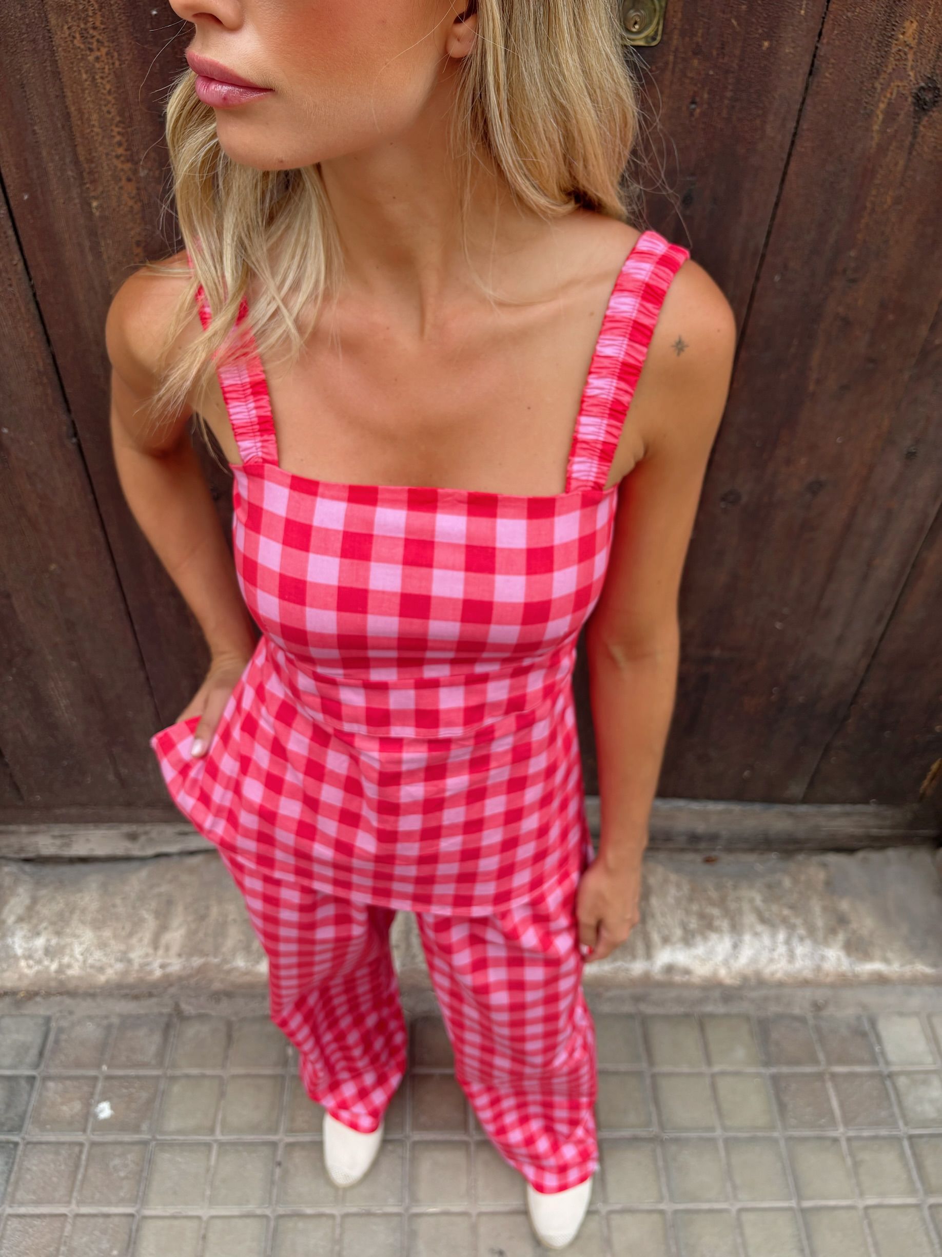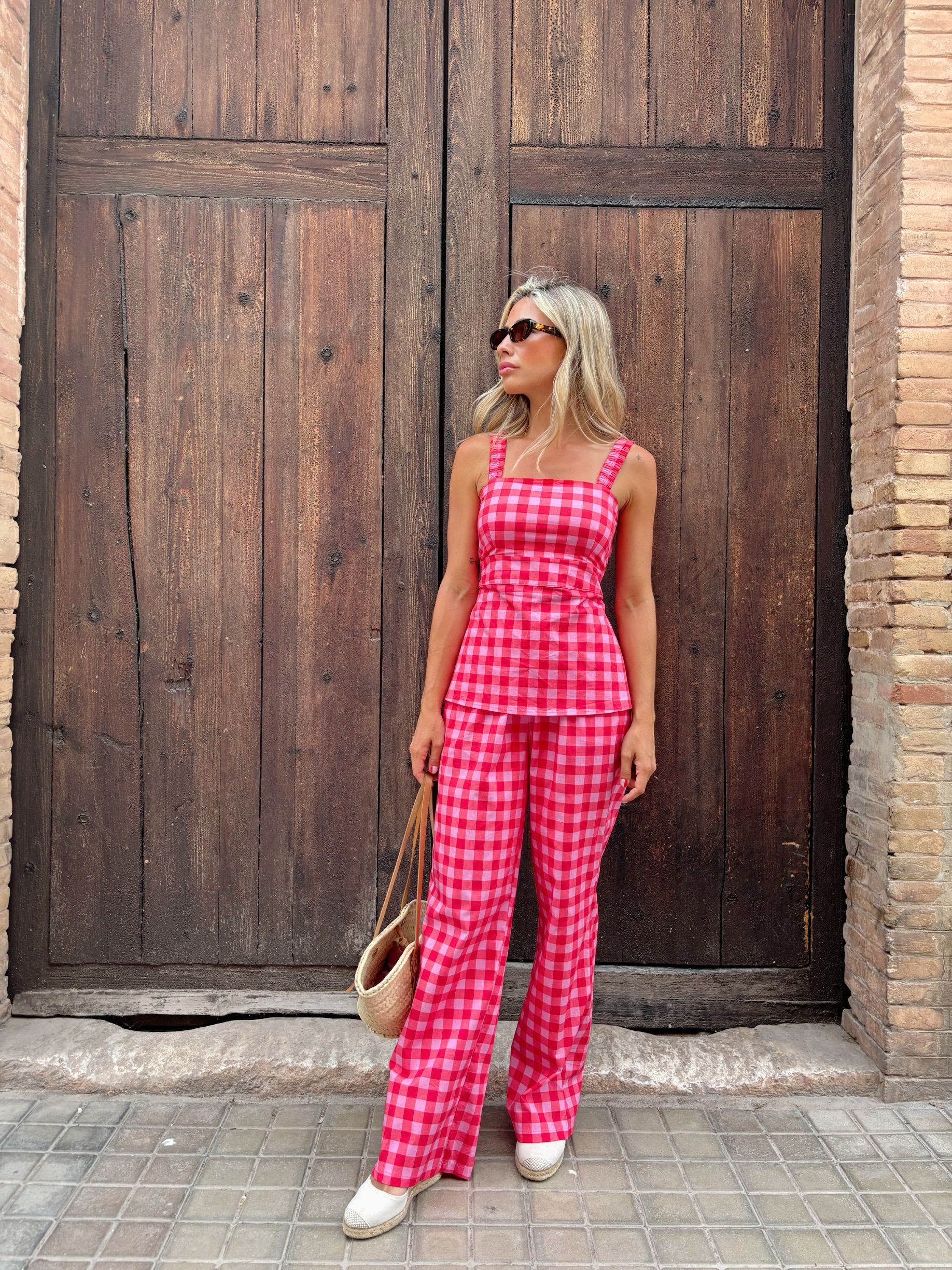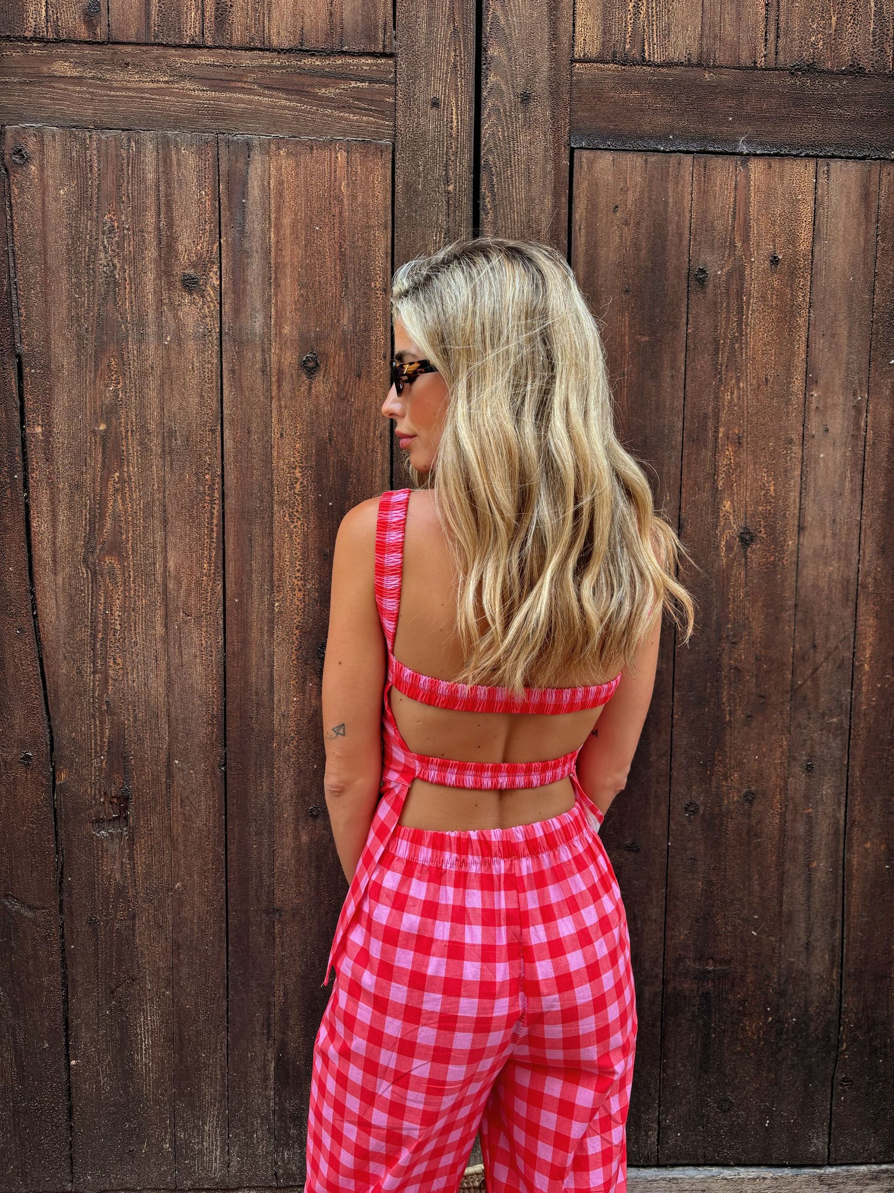 Conjunto de top y pantalones en vichy en tonos rosas. Un total look muy estiloso y especial.