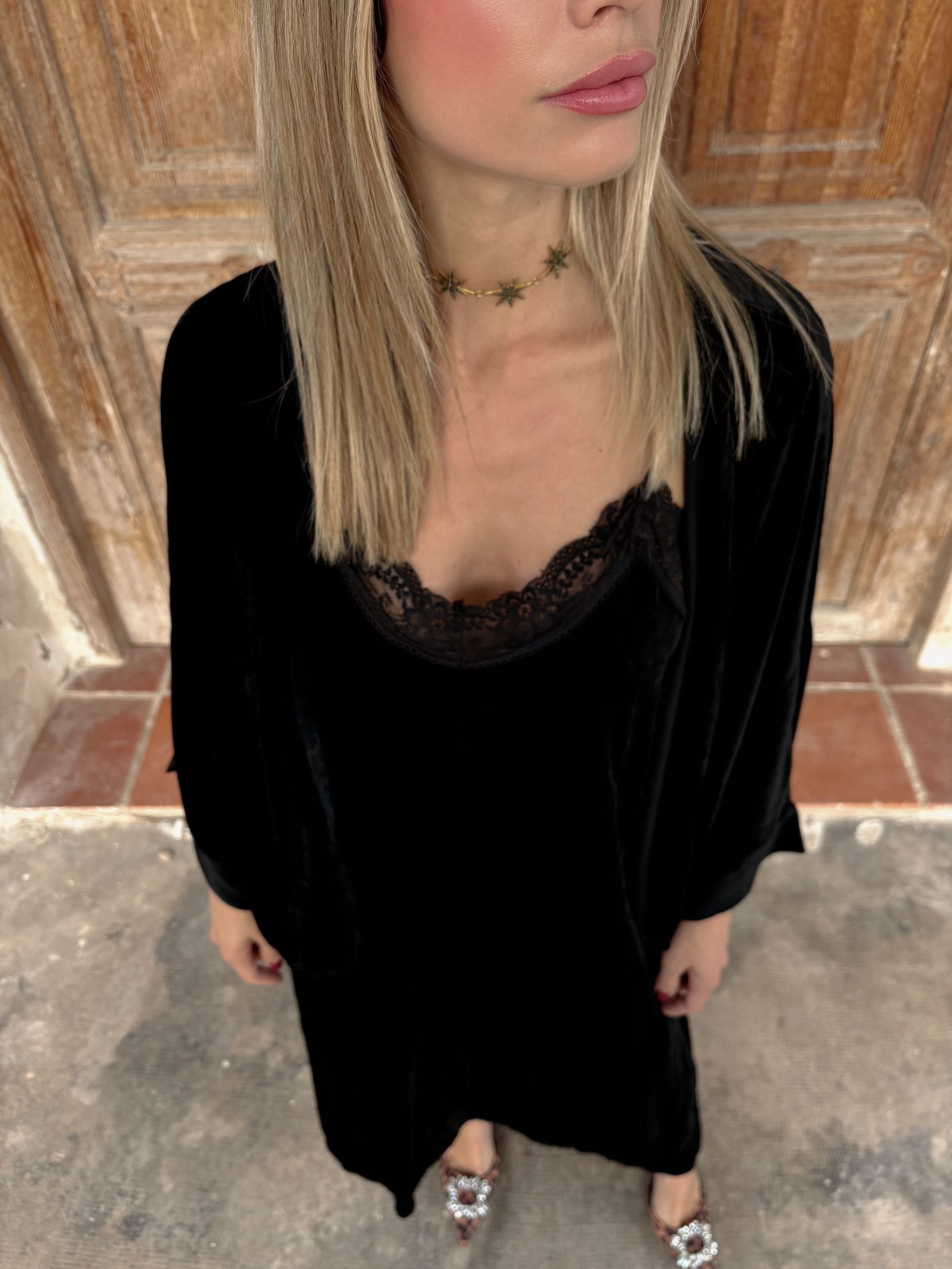 Kimono negro terciopelo con detalle satinado en mangas. Combínalo con el vestido a juego. Luego usarás este kimono tambIén muchísimo.