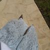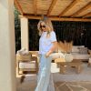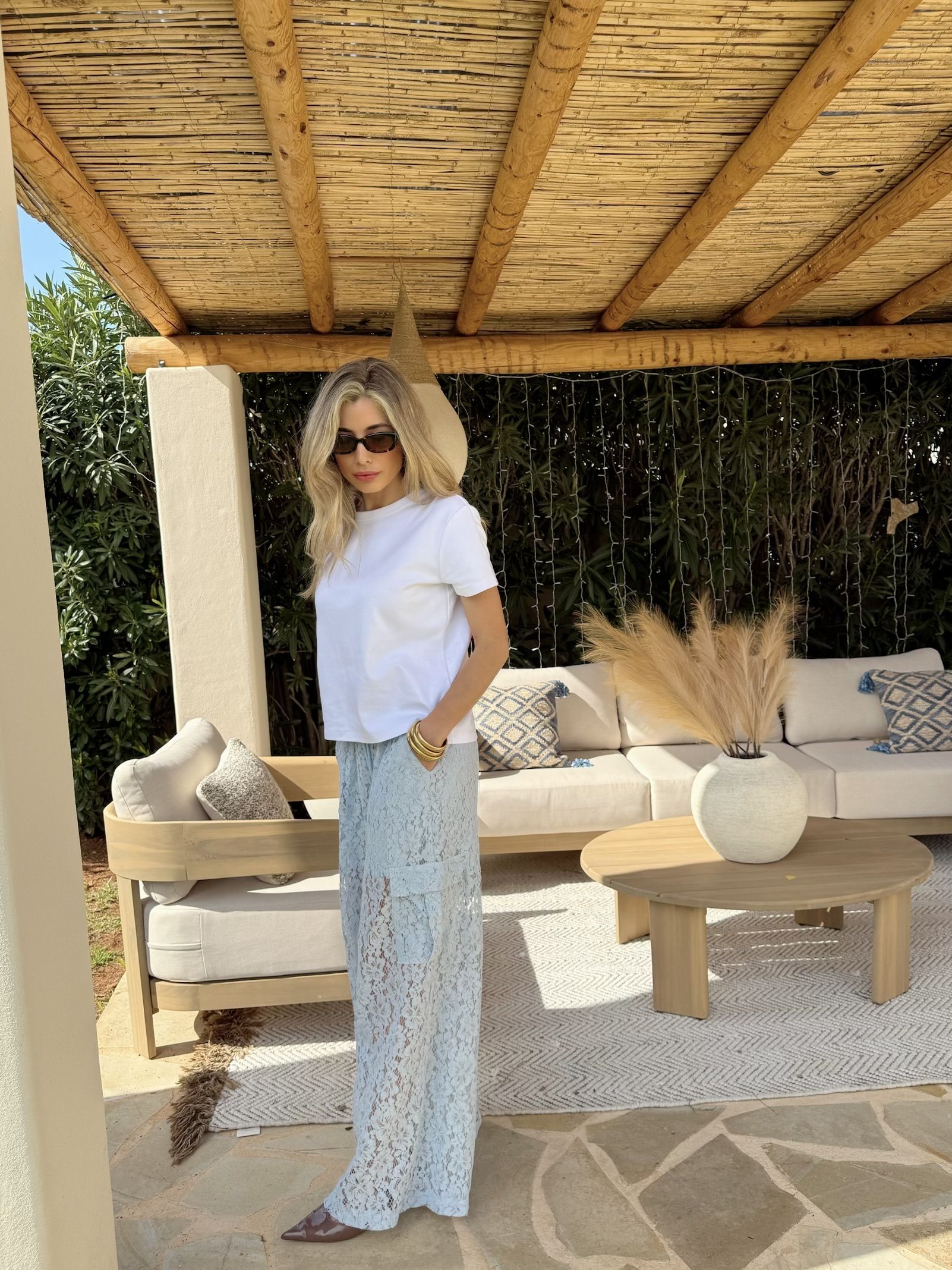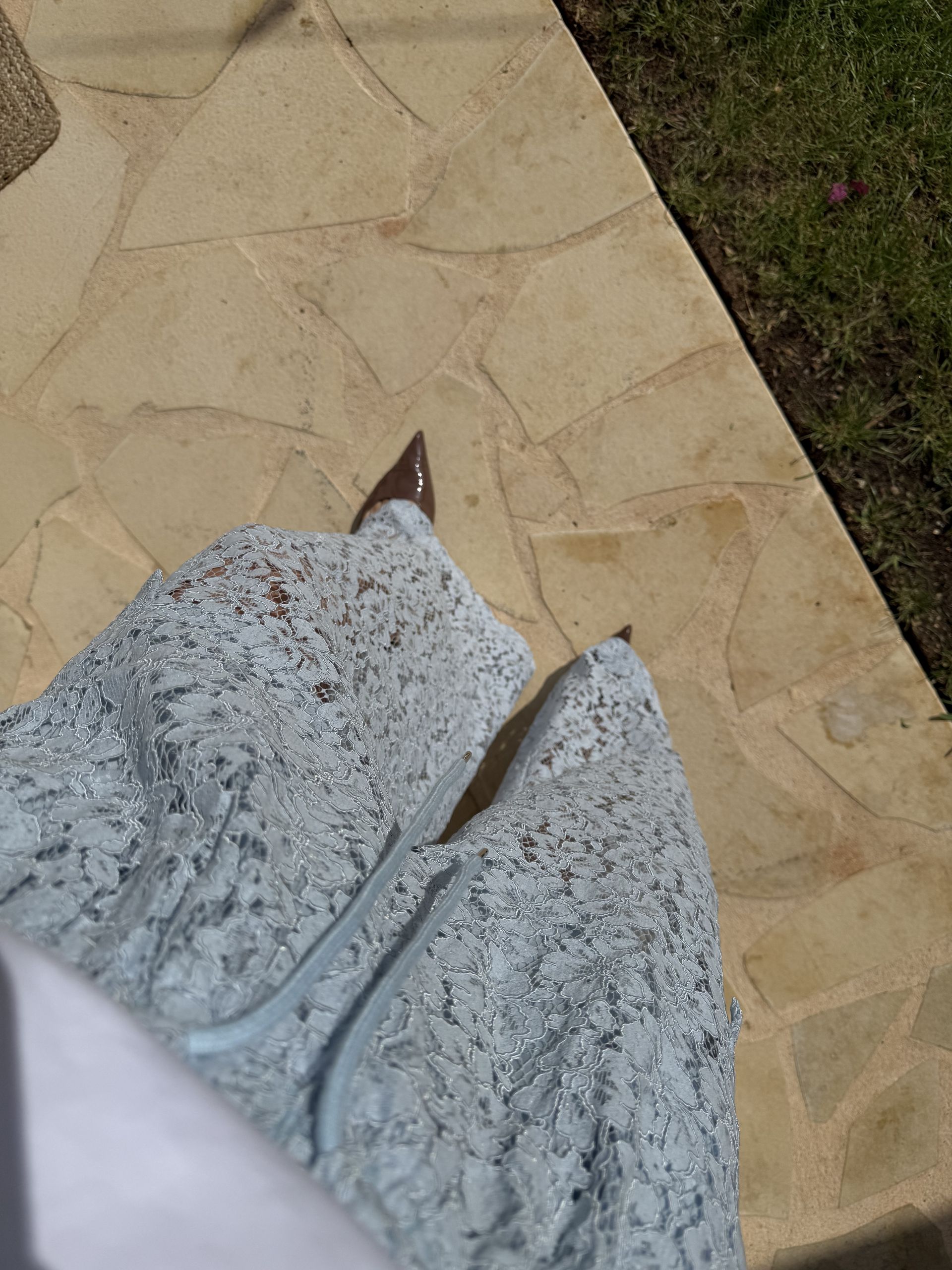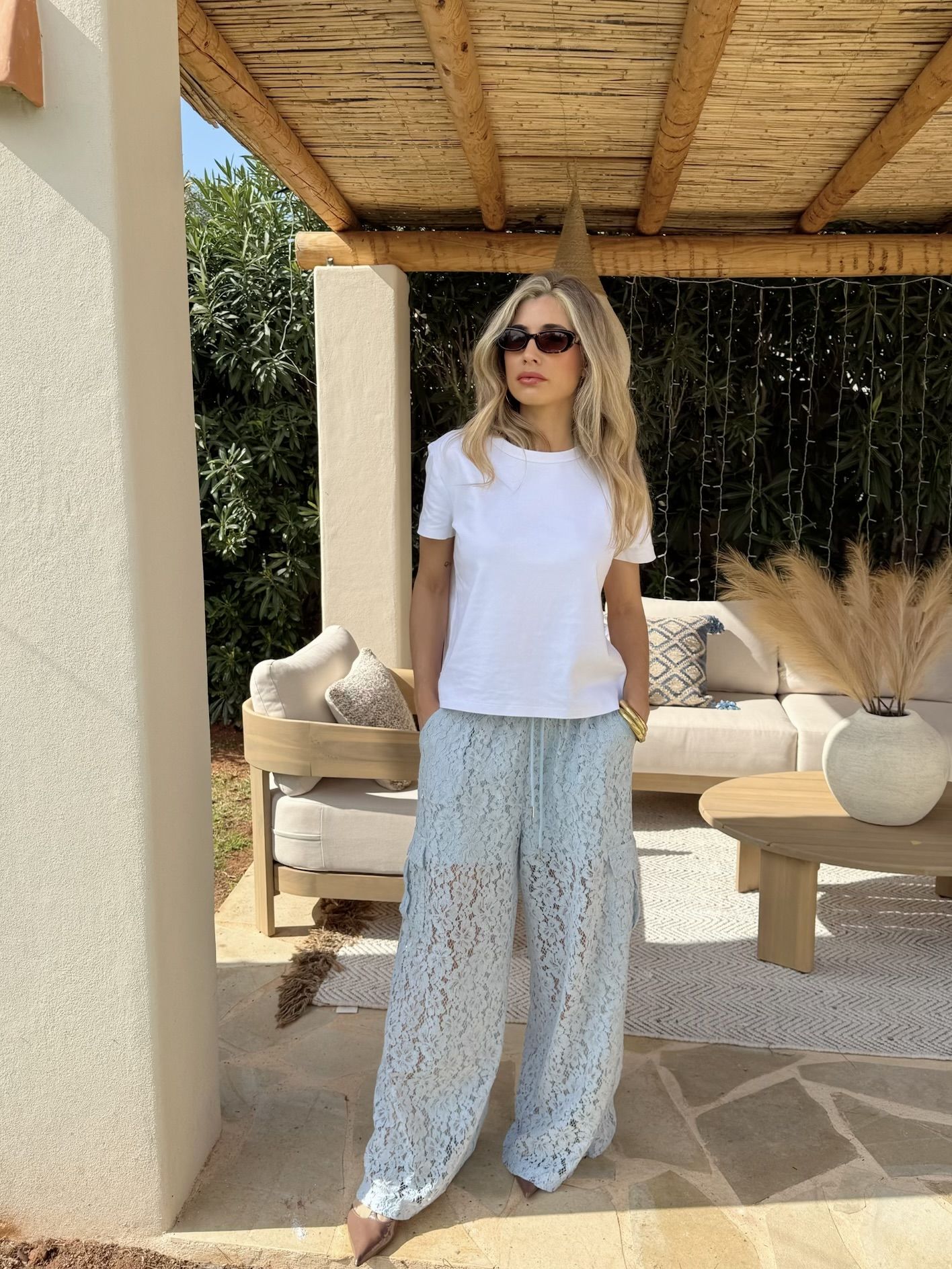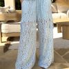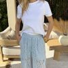 Pantalón encaje azul cielo. Detalle bolsillos laterales. Cintura con goma y cordón.