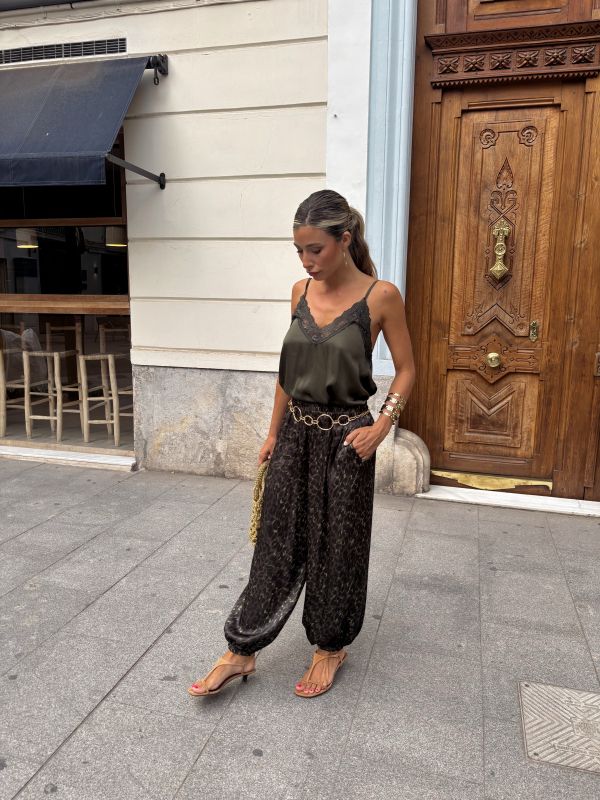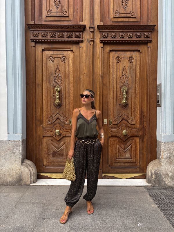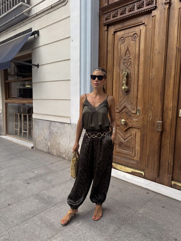 Los pantalones de globo son tendencia este otoño/ invierno y estos satinados en estampado sútil de leopardo en tonos verdes son todo lo que necesitas para crear un look estiloso de vuelta a la ciudad.