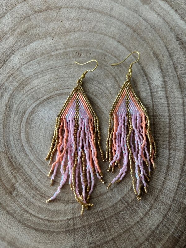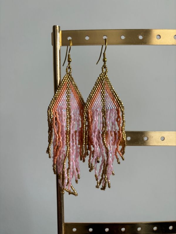 Pendientes cascada largos con cuencas de colores en tonos rosa y coral con detalles en dorado