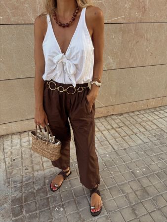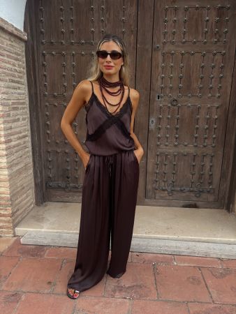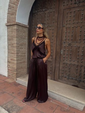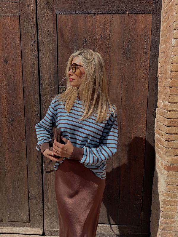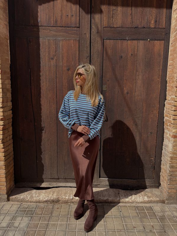 Ya sabréis todas que el chocolate es tendencia y yo estoy obsesionada esta primavera con este color. Me ha gustado combinarla con falda satinada en marrón.