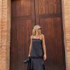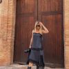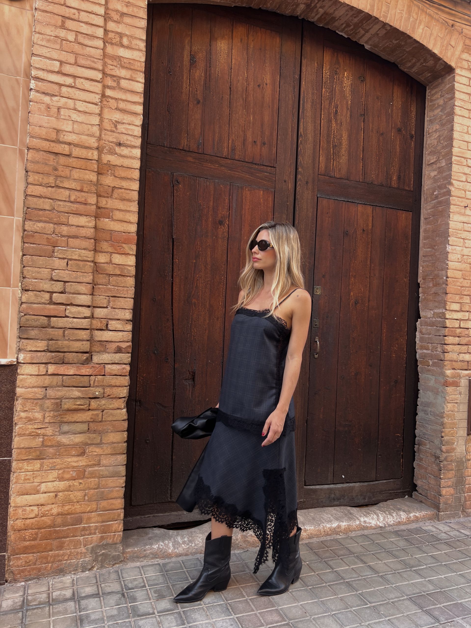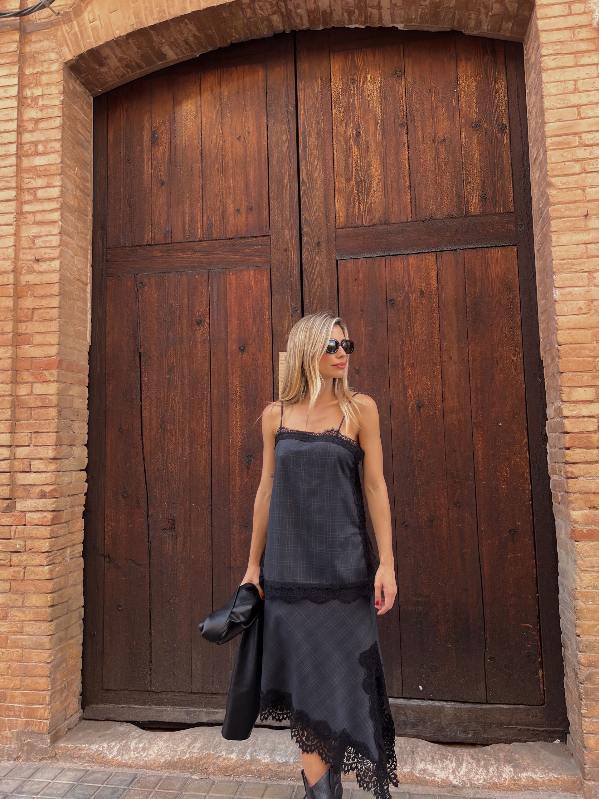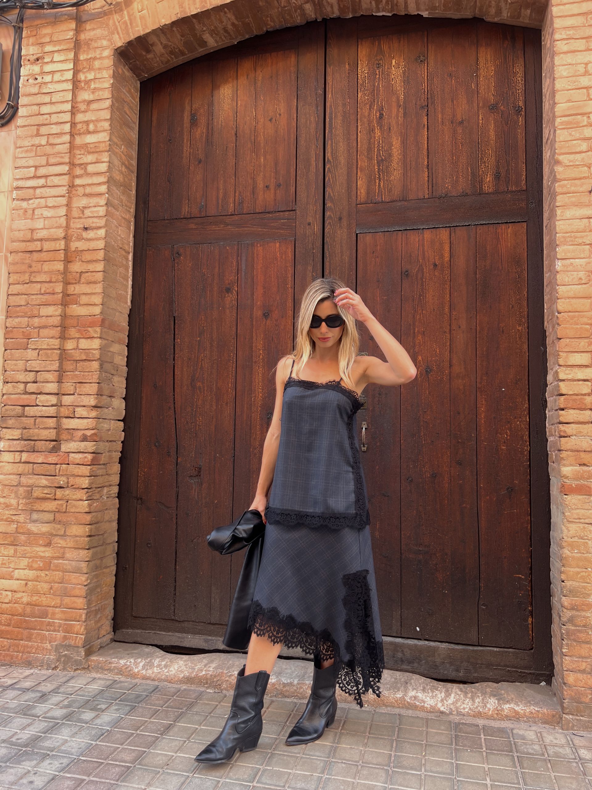 Top tejido sastre azul con detalles cuadros. Su corte en recto y detalle de encaje.