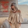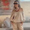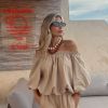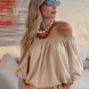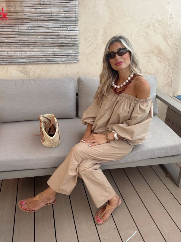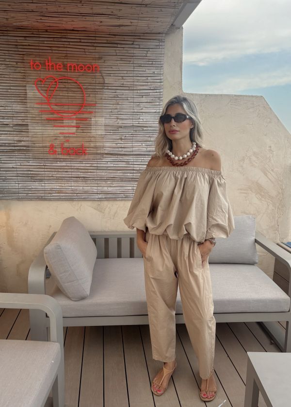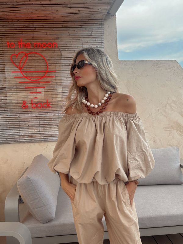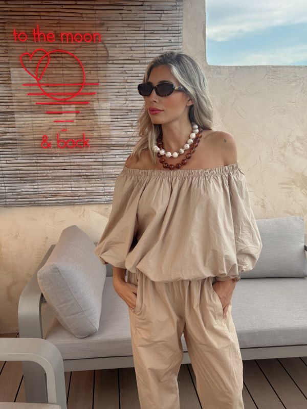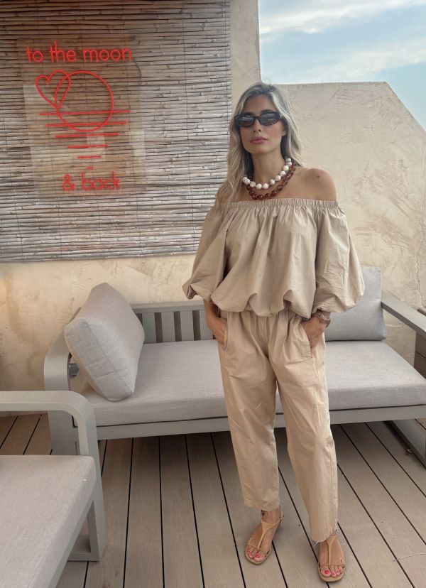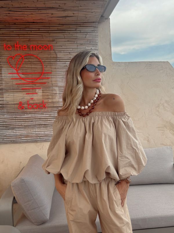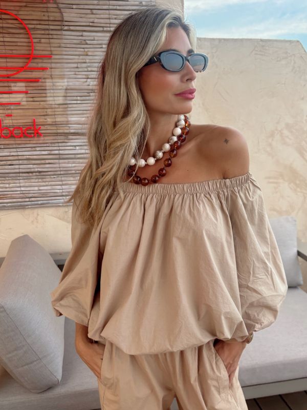 Top color camel con escote con goma para llevar los hombros al aire y efecto globo, tan tendencia este año.