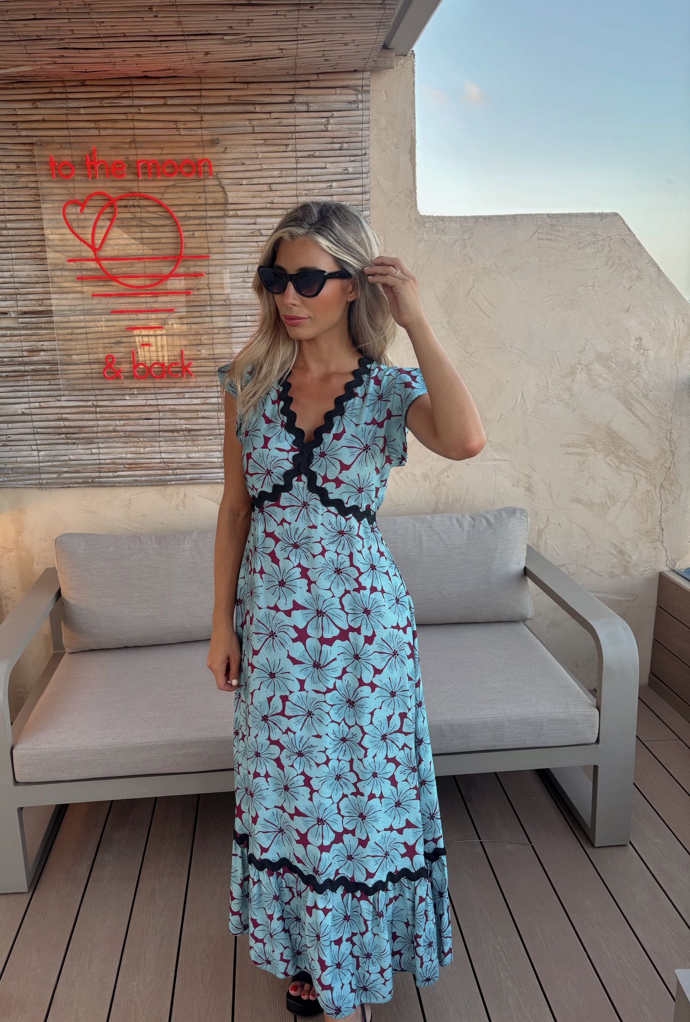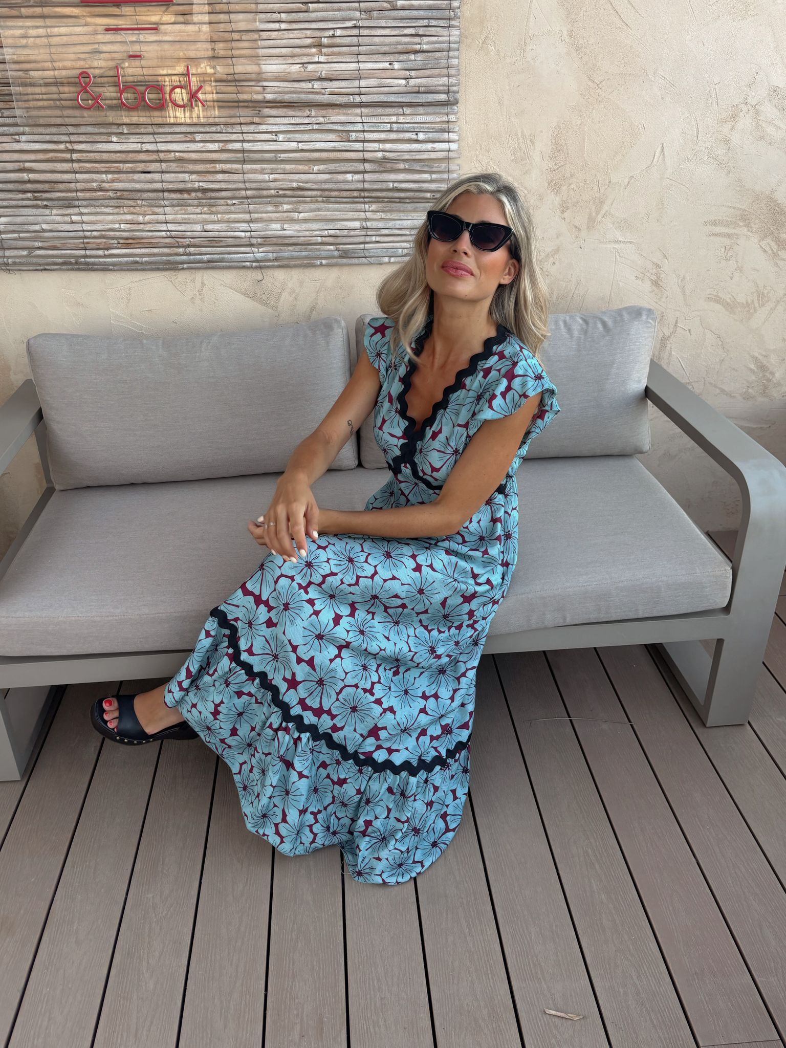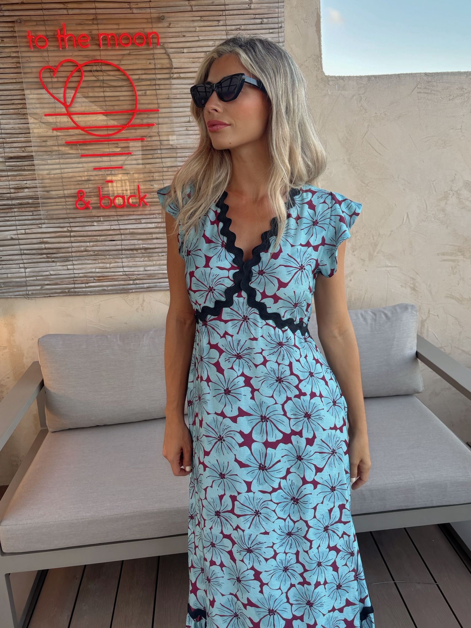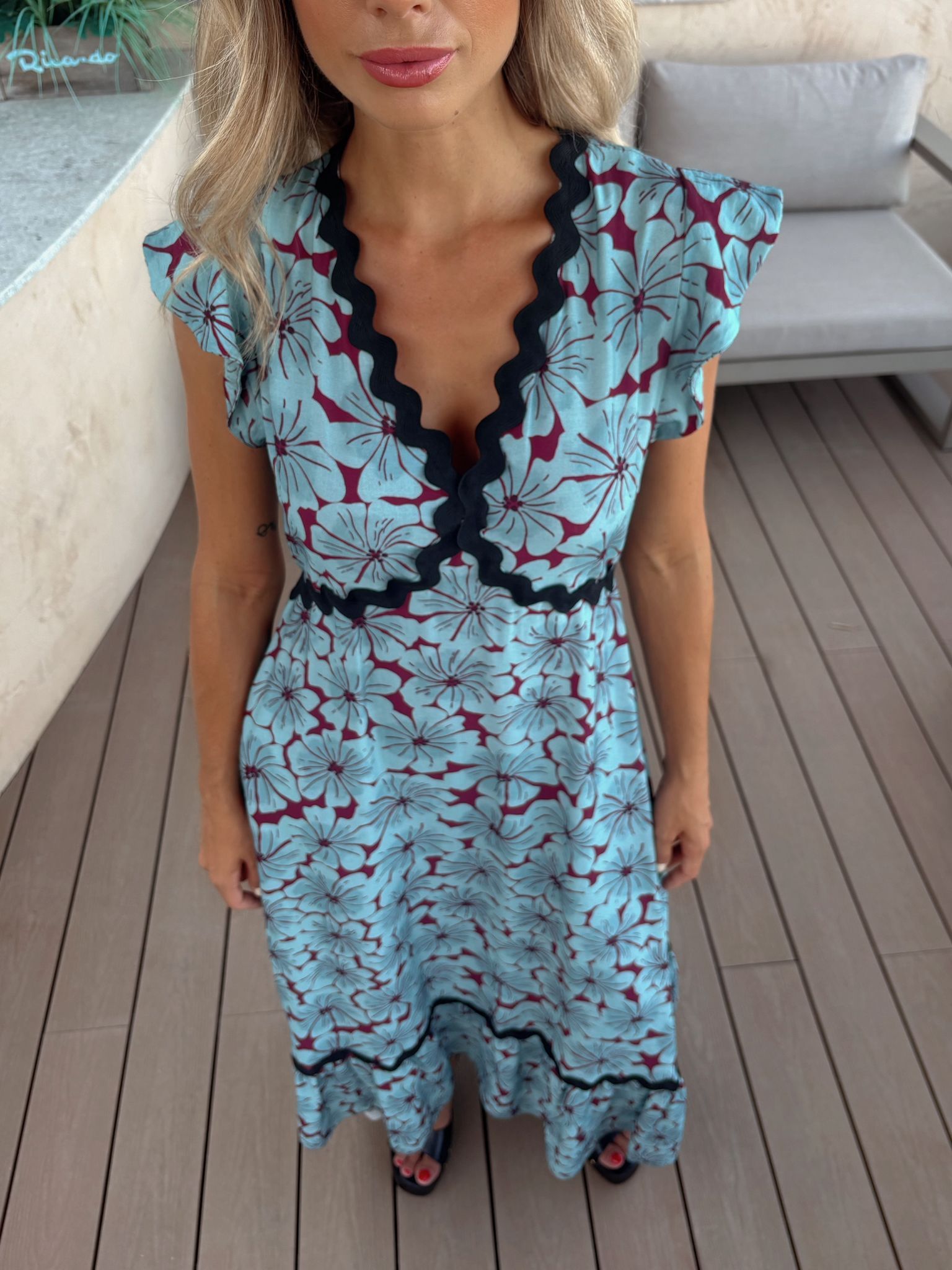 Vestido estampado en tonos muy favorecedores. Su escote sienta de maravila y el detalle del bordado en negro le da un toque especial.