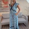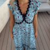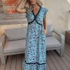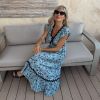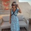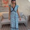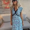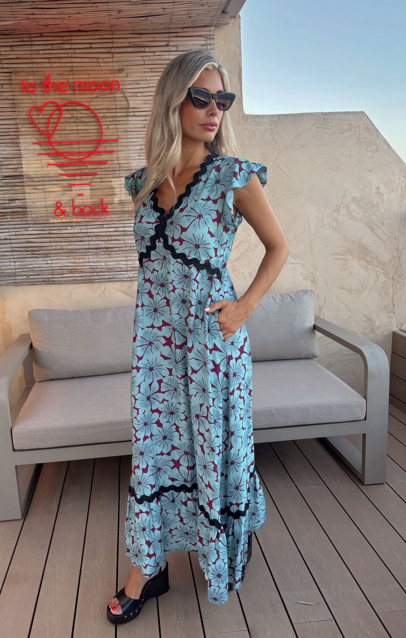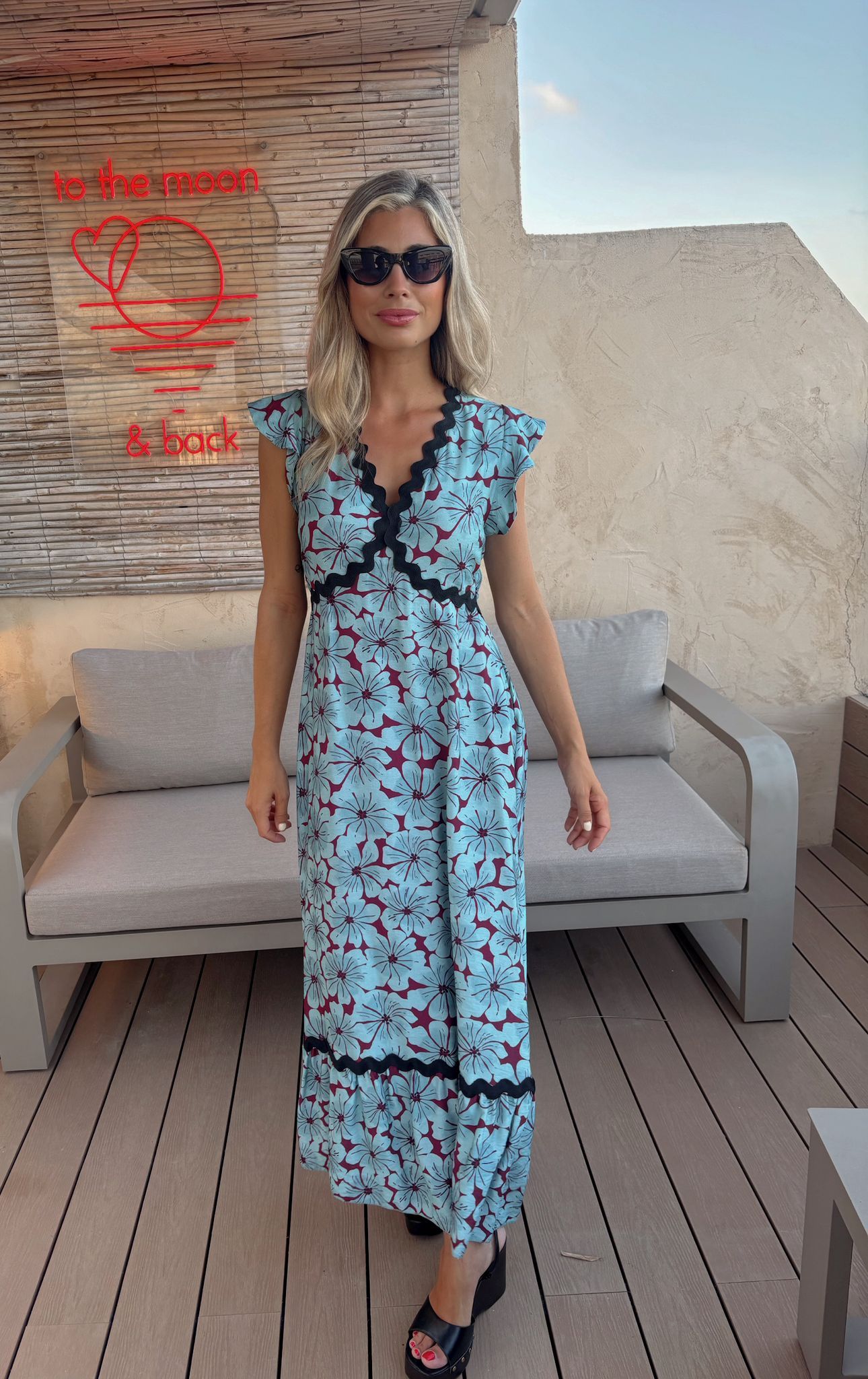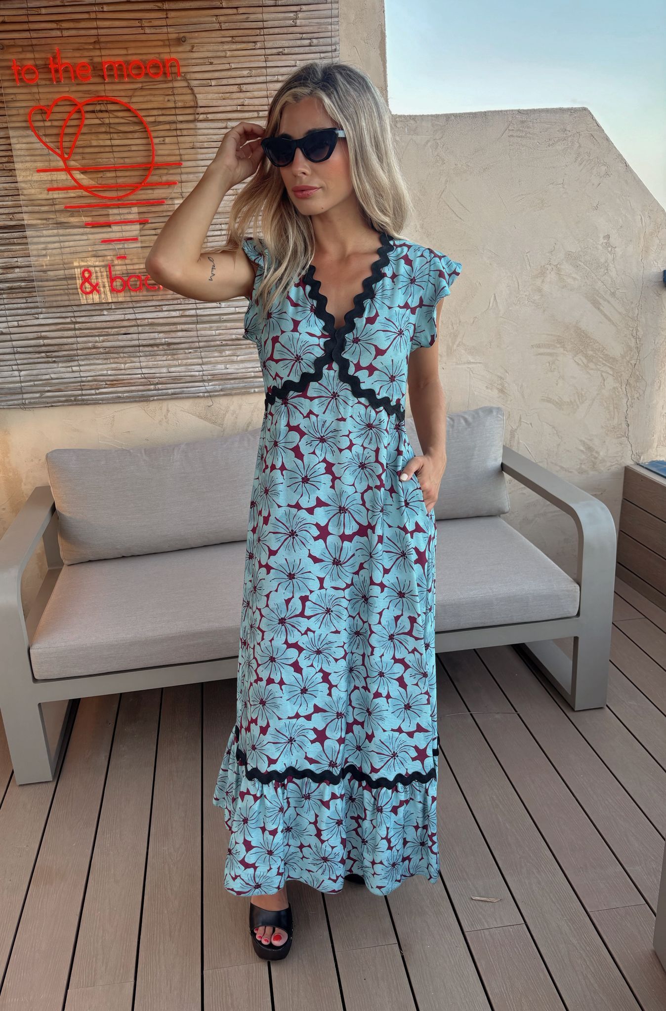 Vestido estampado en tonos muy favorecedores. Su escote sienta de maravila y el detalle del bordado en negro le da un toque especial.