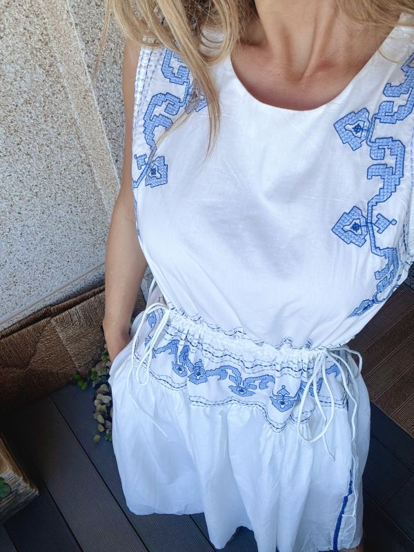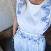 Destaca su bordado de punto de cruz en azul dándole un toque muy especial.